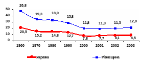 Абсолютні дані народжуваності переконливо свідчать, що починаючи з 60х років вони невпинно зменшуються. При цьому, якщо у 1960 році кількість народжених на 1000 осіб населення становила 26,8 дітей, то в 2003 р. - 12,0 дітей, тобто у 2,3 рази менше. Аналогічна ситуація в міських поселеннях і сільській місцевості. (див. рис.11).