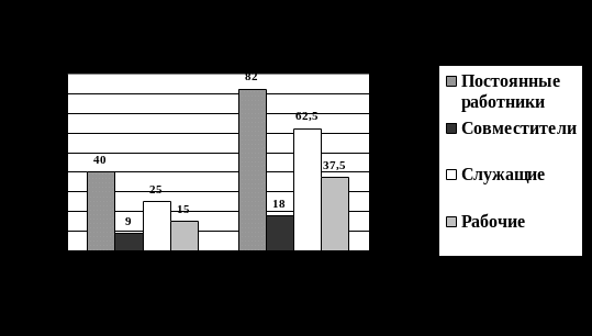 Служащие, в т.ч.: - Руководители - Специалисты - Рабочие 2. Списочная численность персонала, всего, в т.ч. - совместители - постоянные работники | 25 12 6 6 13 31 6 25 | 32 15 6 9 17 39 7 32 | +7 +3 0 +3 +4 +8 +1 +7 | 28,0 25,0 0 50,0 30,8 25,8 16,7 28,0 | 40 25 6 19 15 49 9 40 | +8 +10 0 +10 -2 +10 +2 +8 | 25,6 66,7 0 111,1 41,2 25,6 28,6 25,0 | 100 62,5 0 37,5 100 18,4 81,6 | ||