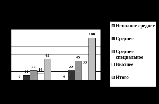 | Неполное среднее Среднее Среднее специальное Высшее Итого | - 11 22 16 49 | - 22 45 33 100 | - 11 13 - 24 | - 45,8 54,2 - 100 | - - 8 11 19 | - - 42,1 57,9 100 | - - 1 5 6 | - - 16,7 83,3 100 | ||