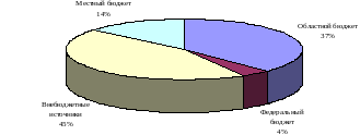 Большая часть финансовых затрат на программу приходится на внебюджетные источники – около 45%, 37% - это финансирование поступает из областного бюджета, 14% - местный бюджет и всего 4% приходится на федеральный бюджет.