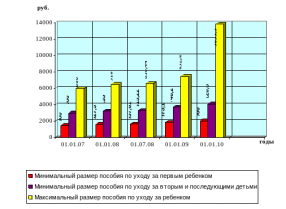 Рисунок 3 - Минимальный и максимальный размеры ежемесячного пособия по уходу за ребенком в возрасте до 1,5 лет гражданам, подлежащим обязательному социальному страхованию, в 2007-2010 гг., руб.