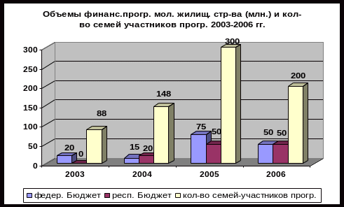 В 2005 году в результате большой организационной работы с федеральным центром по вопросам реализации молодежной жилищной политики в республике удалось добиться выделения 75 млн. рублей из средств федерального бюджета. В свою очередь в качестве софинансирования из республиканского бюджета было выделено 50 млн. рублей. Таким образом, в 2005 году консолидированный объем финансирования программы молодежного жилищного строительства составил 125 млн. рублей, участниками программы стали 300 счастливых молодых семей.