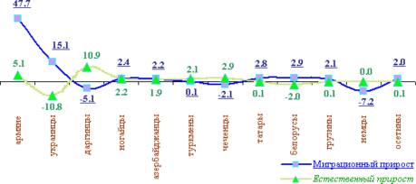 Рисунок 5. Естественное и механическое движение населения в Ставропольском крае по национальностям, 2005г.