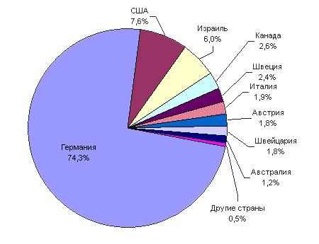 Рисунок 6. Распределение по секторам основных стран эмиграции для граждан Российской Федерации в 2004 г., %