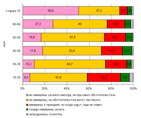 Диаграмма 3. Ответы на вопрос: "Есть ли у Вас намерение уехать на постоянное жительство в другую страну и если да, то когда Вы собираетесь это сделать?", в зависимости от возраста