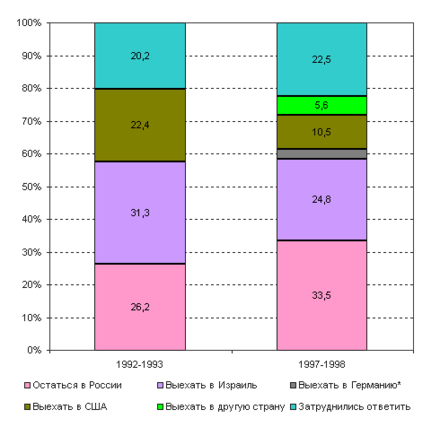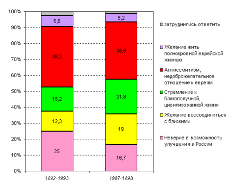 сточник: http://www.demoscope.ruДиаграмма 6. Распределение ответов на вопрос: "По Вашему мнению, какая причина, побуждающая евреев уезжать из России, является главной?"