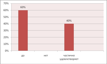 Таким образом, проживающие в большинстве случаев называют следующие варианты ответов: да – 60%, частично удовлетворяют – 40%. Отсюда можно сделать вывод, что респондентов устраивает организация досуга. Проводимые мероприятия проживающим в доме-интернате нравятся полностью.