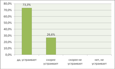 На данный вопрос 73,3% проживающих ответили, что да, устаривает, 26,6% - скорее устраивает. Таким образом, изисследования мы видим, что психологический климат в доме-интернате благоприятный. Обслуживающий персонал относится к проживающим людям в доме-интернате с уважением и пониманием их проблем.