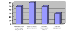В качестве наиболее распространенных методов работы с семьей опрошенные называют психологические группы и тренинги. Также распространенными являются индивидуальны консультации и собрания (тематические встречи). В меньшей степени используются клубные методы работы с семьей ребенка, нуждающегося в государственной защите.