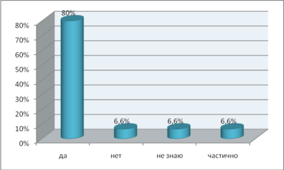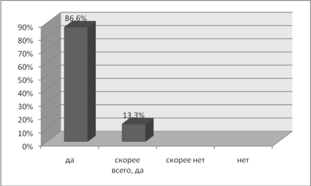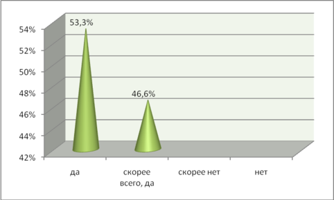 При ответе на данный вопрос 53,3% респондентов отвечают да. И также 46,6% опрошенных отвечают скорее всего, да. Большинство опрошенных считают себя подготовленными к работе с проживающими в доме-интернате, т.е. владеющими достаточным уровнем профессионализма, позволяющими достич наибольших результатов в деятельности дома-интерната.