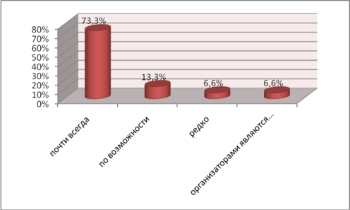 Таким образом, респонденты в большинстве случаев называют следующие варианты ответов: почти всегда – 73,3%. В то же время 13,3% отвечают на вопрос – по возможности. И только 6,6% опрошенных отвечают редко и организаторами являются другие лица. Отсюда, видно, что социальные работники имеют организаторские способности, заинтересованы в работе с клиентами, проявляют инициативу и творчество. Всегда стараются быть первыми в решении большинства вопросов. Не пытаются переложить свою работу на других, а наоборот пытаются помогать друг другу.
