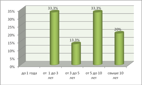 Из данной диаграммы мы видим - 33,3% респондентов отвечают, что работают в данном доме-интернате от 1 до 3 лет и от 5 до 10 лет. Также 20% соиальных работников работают свыше 10 лет. И всего лишь 13,3% опрошенных работают в данном учреждении от3 до 5 лет. Коллектив социальных работников дома-интерната достаточно устоявшийся. Основную часть составляют специалисты уже проработавшие от 1 года до 3 лет и от 5 до 10 лет. Поэтому можно сказать, что коллектив достаточно опытен в оказании социальных услуг, в коллективе сформировано профессиональное поведение: опыт в выполнении должностных обязанностей и функций.