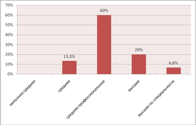 Таким образом, из данного вопроса мы видим, что 60% респондентов имеют среднее профессиональное образование, 20% - высшее, 13,3 – среднее и 6,6% имеют высшее образование по специальности. Отсюда видно, что коллектив обладает достаточным уровнем знаний, умений, т.е. в деятельности социальных служб идет процесс профессионального становления кадров.