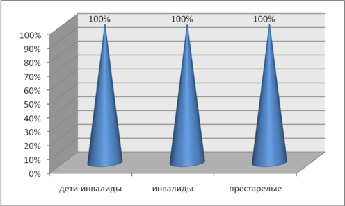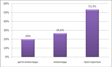 Из данного вопроса мы видим, что 53,3% социальных работников обслуживают такую категорию как престарелые. 26,6% - это инвалиды и 20% - дети-инвалиды. Основной контингент проживающих в доме-интернате составляют пожилые люди.