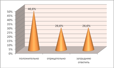 На данный вопрос 46,6% респондентов отвечают положительно и 26,6% опрошенных оценивают материально-техническую оснащенность дома-интерната отрицательно. Можно сделать вывод, что дом-интернат хорошо оснащен в материально-техническом плане. Администрация района и города оказывает всяческую посильную помощь для дома-интерната, но есть проблемы.