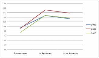 Иностранными гражданами и лицами без гражданства на территории Российской Федерации совершено 17,2 тыс. преступлений, что на 17,5% больше, чем за январь - март 2008 года, в том числе гражданами государств-участников СНГ - 15,8 тыс. преступлений (+19,3%), их удельный вес составил 91,8%.