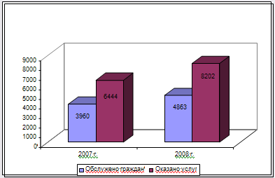 Всего в течение 2008 года обслужено 4863 граждан, им оказано 8202 услуги, в 2007 году обслужено3960 граждан им оказано 6444 услуги.