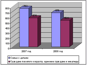 По сравнению с 2007 годом в 2008 году уменьшилось на 8 % и количество состоящих на учете граждан пожилого возраста, инвалидов, одиноких граждан.