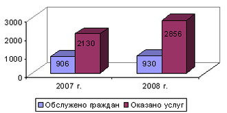 Всего в течение 2008 года обратилось в отделение приема граждан 930 семей, им оказано 2856 услуг, в 2007 году обратилось 906 семей им оказано 2130 услуг.