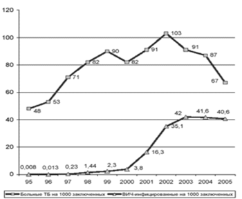Рис.2 Больные туберкулезом на 100 заключенных и ВИЧ-инфицированные на 1000 заключенных в 1995 – 2005 гг.