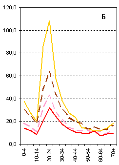 Рисунок 2. Доля отдельных возрастных групп в общей структуре миграционного потока (А), %, и возрастные интенсивности миграции (в расчете на 1000 населения данной возрастной группы) в 1990–2004 гг. (Б), все прибывшие