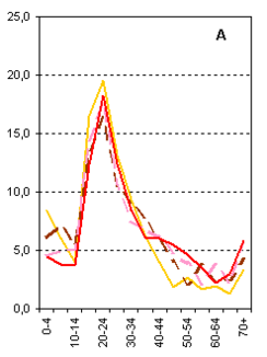 Демографическую структуру населения можно с полным правом назвать одним из важнейших факторов миграции, пространственной мобильности. Наиболее важным, в определенной мере, синтетическим фактором, является возрастная структура населения. Известно, что возрастная структура мигрантов и возрастная интенсивность территориальной подвижности населения – весьма устойчивые во времени и в пространстве параметры миграционного процесса [8]. Как бы ни отличались миграционные потоки по регионам, общему уровню и интенсивности, профили возрастной структуры миграции имеют очень сходные черты по различным странам и регионам. Наиболее высока пространственная мобильность в молодых трудоспособных возрастах, затем она снижается; зачастую возникают всплески активности в околопенсионных возрастах. Все это определяется жизненными циклами индивидов, участвующих в миграции.