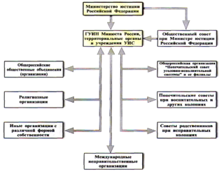В настоящее время помощь общественных организаций уголовно-исполнительной системы ФСИН России осуществляется на основании ст. 23 Уголовно-исполнительного кодекса РФ (1996 г.). В ней говорится, что «общественные объединения оказывают содействие в работе учреждений и органов, исполняющих наказания, принимают участие в исправлении осужденных и осуществляют контроль за деятельностью уголовно-исполнительной системы». Из этого следует, что в понятие «участия в исправлении», в широком смысле слова, включается вся исправительная деятельность, в которую на правах составляющей обязательно входит социальная работа с осужденными. Однако законодательного акта, регламентирующего осуществление контроля за исправительными учреждениями со стороны общественности до настоящего времени не принято.