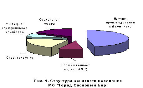 Численность постоянного населения города на 01.01.2009г. составляла 62,9 тыс. человек. Из 29,2 тыс. человек работающих в городе (с учетом малого предпринимательства) – 37,8 % занято в научно-производственном комплексе, 7,0% - в промышленности без ЛАЭС, 16,6 % - в строительстве, 5,7 % - в жилищно-коммунальном хозяйстве, 13,3 % - в социальной сфере. Уровень безработицы на конец 2009 года составил 1,0 %. (рис.1)