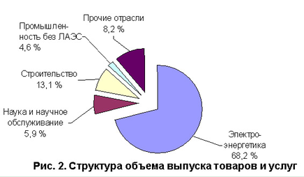Среди отраслей экономики города ведущая роль принадлежит атомной электроэнергетике. Ленинградская атомная электростанция - крупнейшее предприятие города, доля которого в общем объеме промышленной продукции города составляет более 90 %, в структуре городского бюджета доходы от деятельности ЛАЭС составляют около 70 %, в общем объеме промышленной продукции по области - 7,1% (табл. 2, рис. 2).