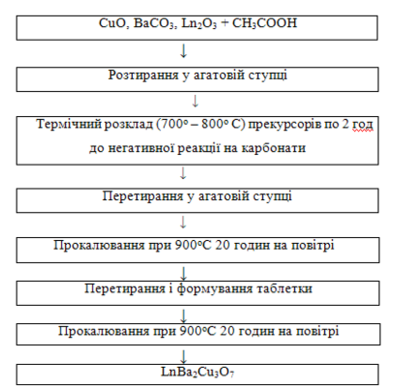 Оксиди рідкісноземельних елементів перед використанням перевірялись на вміст основного компоненту методом хімічного аналізу. Застосовували метод трилонометричного титрування в уротропіновому буфері з індикатором ксиленовим оранжевим [38]. Загальна схема синтезу твердих розчинів LnBa2Cu3O7 показана на рис. 2.1.: