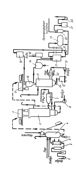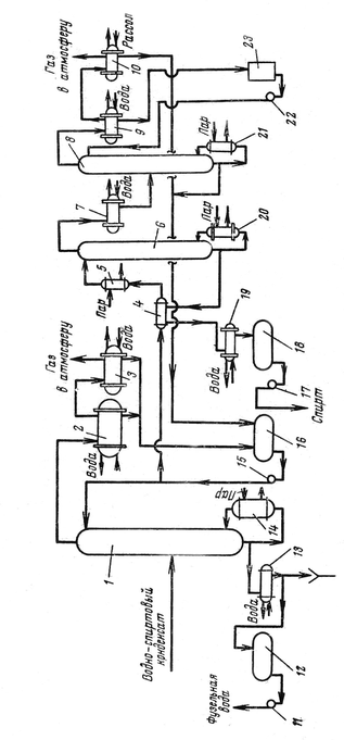 1, 6, 8 – ректификационные колонны; 2, 3, 7, 9, 10 – конденсаторы-дефлегматоры; 4 – теплообменник; 5 – паровой подогреватель; 11, 15, 17, 22 – насосы; 12, 16, 18 – ёмкости; 14, 20, 21 – кипятильники; 23 – сборник.
