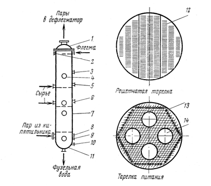 1 – крышка; 2, 3, 5, 6, 9 – штуцеры для термопар; 4 – люки; 7 – корпус; 8, 10 – штуцеры для замера уровня в кубе; 11 – днище; 12 – прорези; 13 – отверстия для слива жидкости; 14 – отверстия для прохода паров.