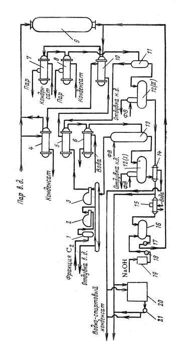 1 - буфер; 2 - компрессор свежего этилена; 3 - компрессор циркулирующего газа; 4 - паровой подогреватель; 5, 10, 14 - теплообменники; 6, 15 - холодильники; 7,8 - котлы-утилизаторы, 9 - реактор; 11 - сепаратор; 12(1), 12(11) - газоотделители; 13 - скруббер; 16, 20 - ёмкости; 17, 18, 21 - насосы; 19 - сборник; ФВ - фузельная вода