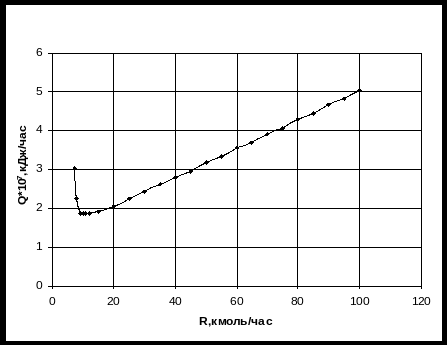 По графику видно, что энергетически более выгодная схема с охватом рециклом двух реакторов, т. к. при фиксированной величине рецикла в ней энергозатраты меньше по сравнению со схемой с охватом рециклом одного реактора. И оптимальная величина рецикла требует меньших энергетических затрат в системе с подачей рецикла на вход первого реактора. Например, при фиксированной величине рецикла R=10 кмоль/час, энергозатраты в системе с охватом рециклом двух реакторов Q=1,60514*107кДж/час, а в системе с охватом рециклом одного реактора Q=186636*107кДж/час.