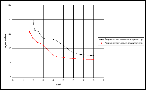По графику видно, что при больших величинах рецикла или объема обе зависимости очень близки, а при малых величинах рецикла или объема зависимости отдаляются друг от друга. Например, при фиксированном суммарном объеме реакторов V = 300м3, величина рецикла в системе с охватом рециклом двух реакторов R = 5,015657 кмоль/час, а с охватом одного реактора R = 5,175953 кмоль/час. А при суммарном объеме реакторов V=10м3, величины рецикла соответственно равны 14,27051 и 27,5 кмоль/час. Причем, схема, в которой рецикл охватывает два реактора, оказывается выгоднее, чем схема, в которой рецикл охватывает один реактор.Т. к. в первой при малых величинах суммарного объема реакторов требуется меньшая величина рецикла, для достижения заданной конверсии, чем во второй.