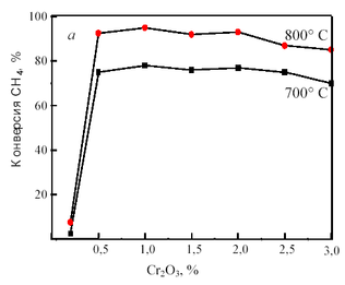 Рис. 14. Зависимость конверсии метана на катализаторе NiO-Cr2O3/MgO от содержания Cr2O3 при фиксированном содержании NiO (3%) (а) и от содержания NiO при фиксированном содержании Cr2O3 (2%) (б)