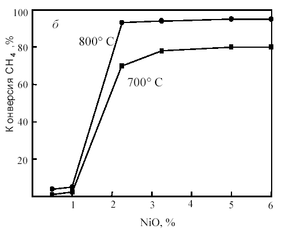 Оксид ZrO2 в катализаторе Ni/ZrO2-MgO стабилизирует состояние никеля на носителе MgO [23]. Температура восстановления NiO повышается с ростом количества MgO. Так, катализатор Ni/ZrO2 без MgO при 800 °С очень мало активен, добавление же всего 1% MgO приводит к 90%-ной конверсии метана, что близко к равновесию.