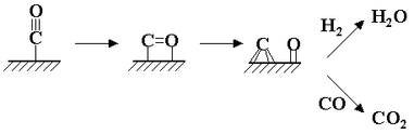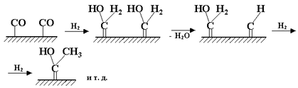 Второй механизм, названный гидроксикарбеновым, предполагает также гидрирование координированного на металле СО с образованием поверхностных гидроксикарбеновых фрагментов, в результате конденсации которых и происходит образование С-С-связей: