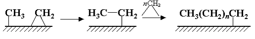 Удлинение цепи происходит в результате реакции поверхностных метила и метилена и далее путем внедрения метиленовых групп идет рост цепи: