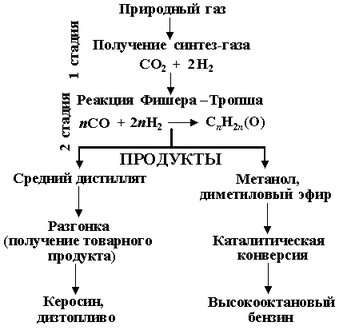 Реакция напрямую неосуществима. Конверсия газа в жидкое топливо (КГЖ) проходит через ряд технологических стадий (рис.17). При этом в зависимости от того, какой конечный продукт необходимо получить, выбирается тот или иной вариант процесса.