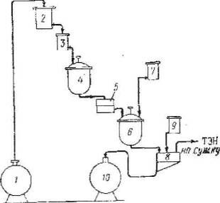 Рис. 3, Схема перекристаллизация тэна: 1-хранилище ацетона, 2-мерник-автомат ацетона, 3-подогреватель, 4-растворитель, 5-фильтр, 6-кристаллизатор, 7 и 9-мерник воды, 8 – вакуум-воронка, 10-сборник маточного ацетона