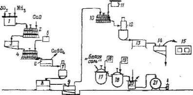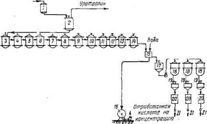 Рис. 5. Схема получения гексогена окислительным методом: 1-бак для охлаждения HNО3, 2-нитратор, 3 по 8-буферные аппараты для донитоовывания, 9, 10 – аппараты для окисления, 11 по 14-охладники, 15 – центрифуга, 16-приемник, 17 – метатель, 18-автоклавы, 19-аппарат для флегматизации, 20-фильтр-воронки, 21-мешки