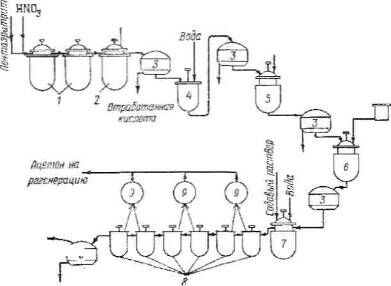 Рис. 4 Схема получения тэна с периодическим отжимом отработанной кислоты: 1-нитраторы, 2-разбавитель, 3-фильтры, 4-промывной аппарат, 5 – нейтрализатор, 6-растворитель, 7-кристаллизатор, 8-дистилляторы, 9 – конденсаторы ацетона