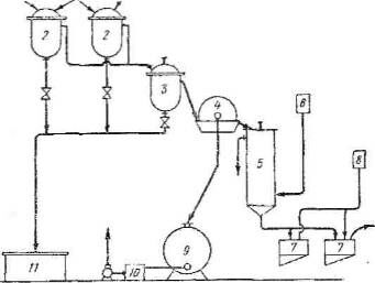 Рис. 2. Схема получения тэна с непрерывным отжимом отработанной кислоты: 1-напорный бак азотной кислоты, 2-основные нитраторы, 3 – буферный нитратор, 4-вакуум-фильтр, 5-промывная колонна, 6 и 8 – напорные баки для воды, 7-вакуум-воронка, 9-отстойник отработанной кислоты, 10-сборник, 11-аварийный бак