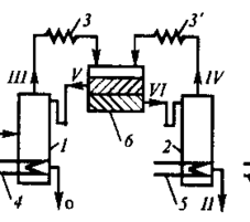 Рис.1.4. Схема установки для экстрактивной ректификации: 1,2- ректификационные колонны, 3,4- насосы, 5- кипятильники, 6- конденсаторы; I- охлаждающая вода, II- греющий пар, III-конденсат, IV- восполнение потерь экстрагирующего агента.