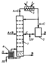 Рис.1.2. Схема установки для азеотропной ректификации: 1- колонна для азеотропной ректификации, 2- узел разделения компонентов А и С, 3- конденсатор, 4- кипятильник; I- охлаждающая вода, II- греющий пар, III-конденсат, IV- восполнение потерь разделяющего агента.