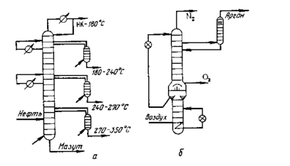 Рис. 1.5. Схемы промышленных ректификационных комплексов с частично связанными тепловыми потоками: а – с боковыми отпарными секциями для разделения сырой нефти на фракции; б – с боковой укрепляющей секцией для разделения воздуха на кислород, азот и аргон [13].