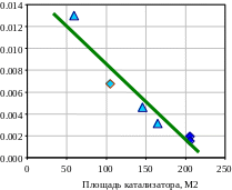 Существуют работы …., в которых исследуется влияние свободной поверхности катализатора на конверсию оксида азота (рис 3). Существуют также экспериментальные данные, ясно указывающие на то, что конверсия оксида азота линейно уменьшается с ростом удельной поверхности катализатора.