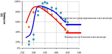 ис 2. Зависимость конверсии оксида азота от температуры.На блочном катализаторе в области низких температур конверсия больше, чем на гранулированном. Гранулированный катализатор обладает большей свободной поверхностью, а, следовательно, диффузия должна быть интенсивнее, а следовательно, и конверсия выше. Значит, определяющим фактором является не диффузия, а химизм процесса.