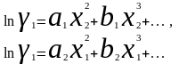 Уравнение Маргулеса является наиболее старым из числа применяемых в настоящее время. Исследования Маргулеса были выполнены еще до того, как были сформулированы такие понятия, как фугитивность и коэффициенты активности, однако в сущности его предложения сводятся к представлению lnγ1 и lnγ2 в виде степенных рядов по составу: